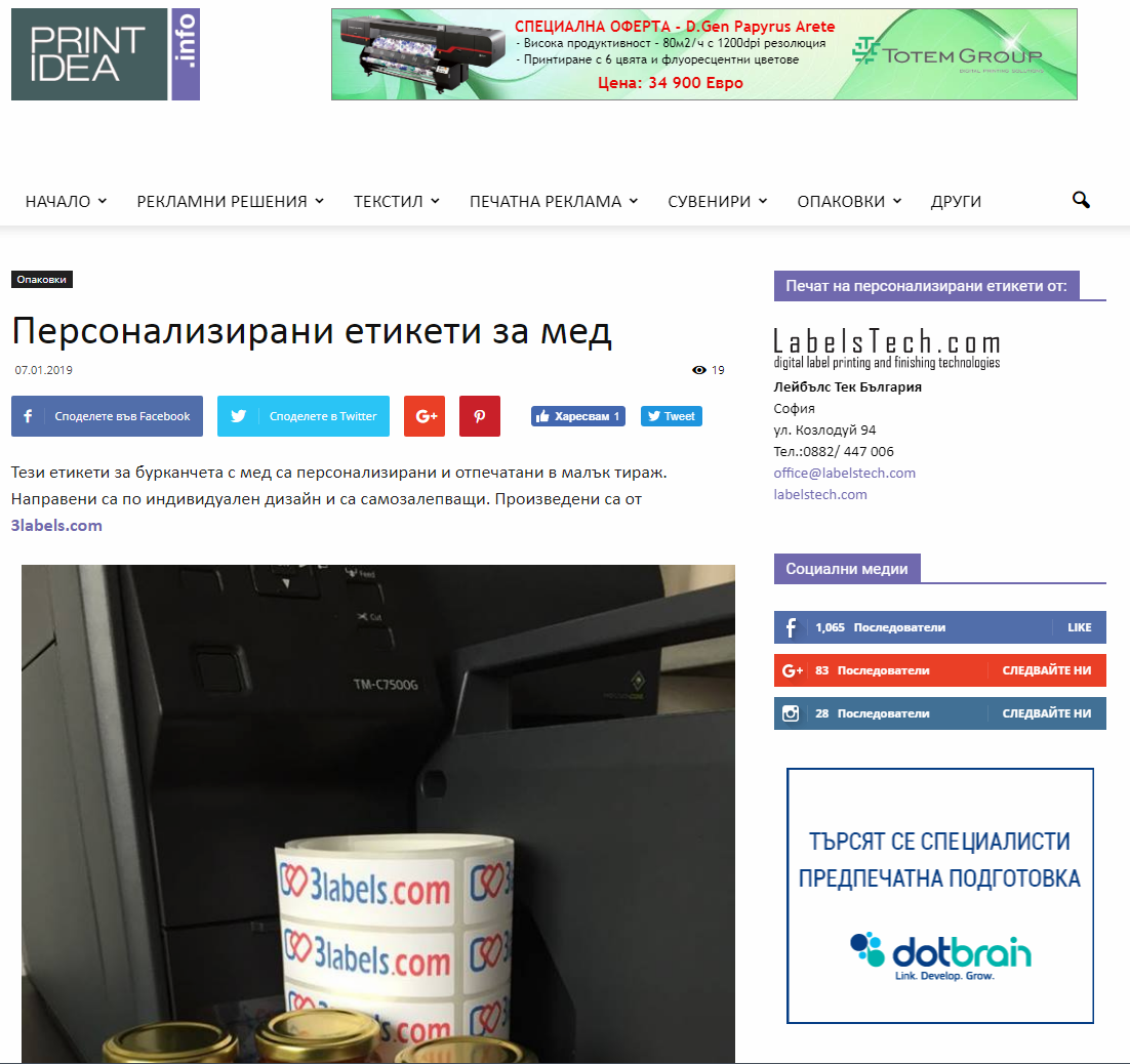 От www.3labels.com сме изключително благодарни на printidea.info, за статията за персонализирани етикети за мед, която написаха за нас.